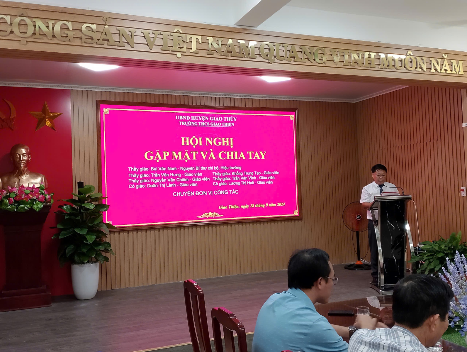 Ngày 18/09/2024, trong không khí ấm áp và đầy xúc động Nhà trường & Công đoàn Trường THCS Giao Thiện long trọng tổ chức Hội nghị gặp mặt và chia tay cán bộ giáo viên chuyển đơn vị công tác. Chúng tôi – những đồng nghiệp và học trò – cùng nhau tập trung gặp mặt và tạm biệt những người bạn, người đồng chí đồng nghiệp của mình: Thầy Bùi Văn Nam – Nguyên Bí thư Chi bộ, Hiệu trưởng; Thầy Trần Văn Hưng – Nguyên giáo viên nhà trường; Thầy Khổng Trung Tạo – Nguyên giáo viên nhà trường; Cô Lương Thị Huế – Nguyên giáo viên nhà trường; Thầy Nguyễn Văn Chiêm – Nguyên giáo viên nhà trường; Cô Doãn Thị Lành – Nguyên giáo viên nhà trường; Thầy Trần Văn Vĩnh – Nguyên giáo viên nhà trường chuyển trường. Đó không chỉ đơn thuần là một buổi chia tay, mà còn là dịp để chúng tôi bày tỏ lòng biết ơn sâu sắc đến người đã gắn bó với chúng tôi trong suốt thời gian qua.